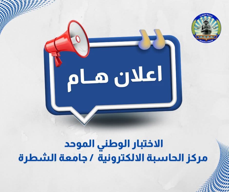 الى السادة المتقدمين الى الاختبار الوطني في مركز الحاسبة الالكترونية / جامعة الشطرة في الاسبوع الماضي و تم تأجيل مواعيد الامتحانات بسبب العطلة ( يوم الاربعاء والخميس 1-2/ 4 /2026 )