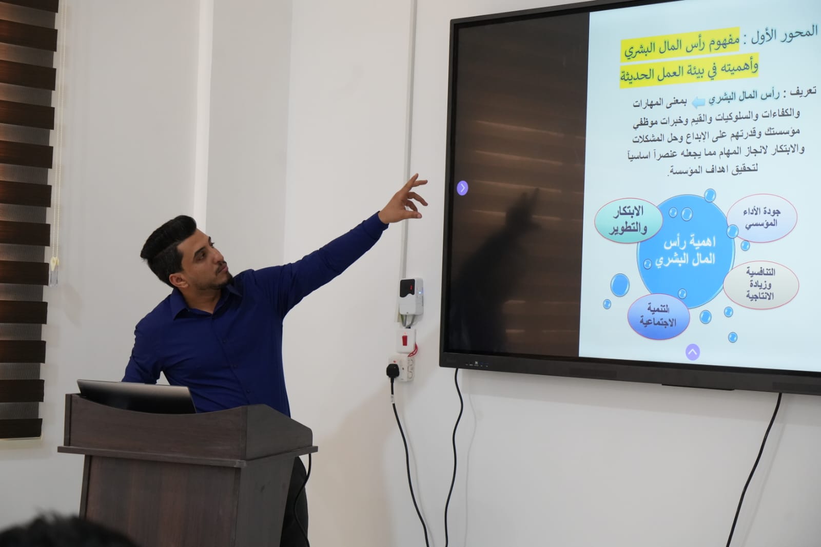 وجاءت الدورة التدريبية تحت عنوان "تطوير رأس المال البشري لمواكبة التغيرات التنظيمية المعاصرة"، واستمرت على مدى يومين متتاليين، حيث قدّم في اليوم الأول الدكتور حسين رزاق رشيح محاضرة تناولت تطوير القدرات البشرية وتعزيز الأداء المؤسسي، فيما ألقى في اليوم الثاني الأستاذ محمد عامر عيسى محاضرة ركّزت على التغيرات التنظيمية الحديثة وأساليب التكيّف معها في بيئة العمل الأكاديمي والإداري.