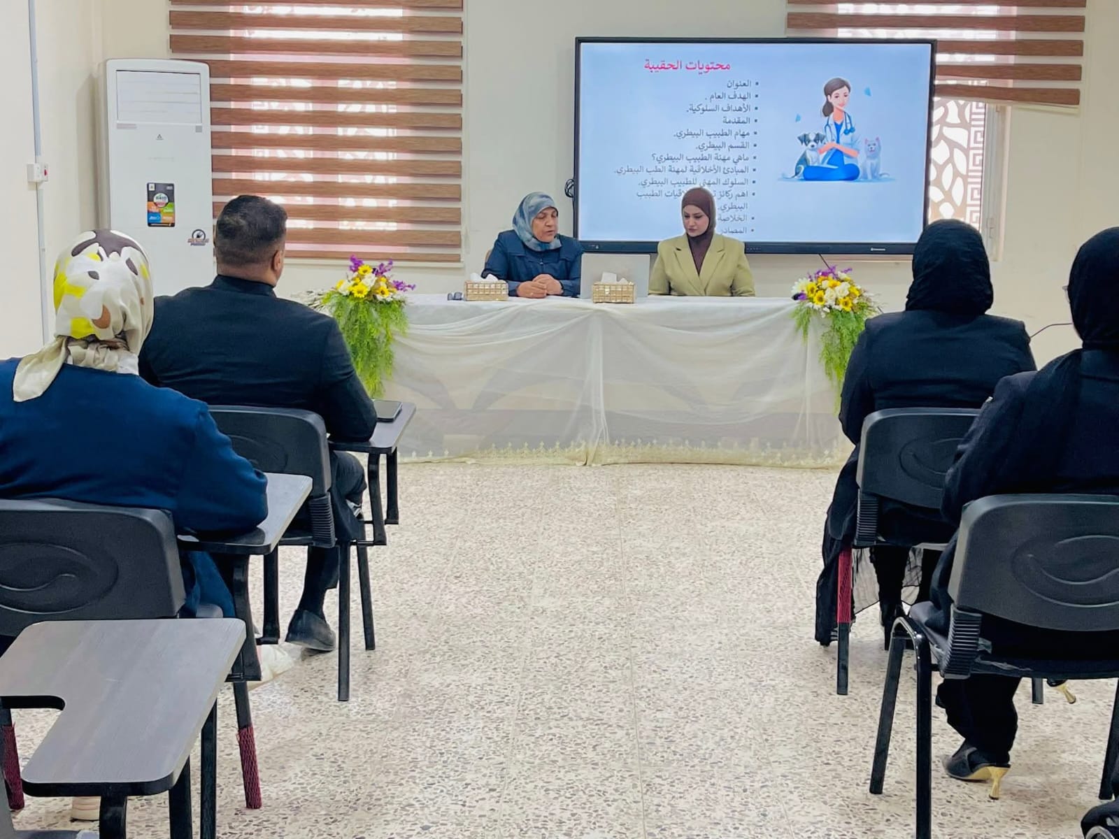 حاضر في الدورة كلٌّ من أ.م.د نبيل مهدي عبد، والسيدة زينب عبد الأمير، والسيدة نبأ داخل، حيث تناولت الدورة محاور عدة من بينها التعريف بمهنة الطب البيطري، والهدف العام والأهداف السلوكية للدورة، فضلاً عن مهام الطبيب البيطري ودوره في حماية الثروة الحيوانية وخدمة المجتمع.