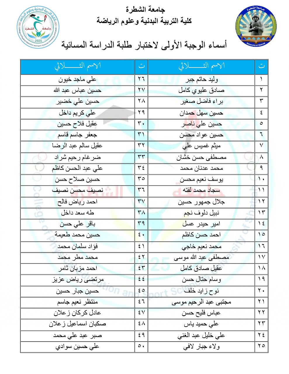 علنت كلية التربية البدنية وعلوم الرياضة عن تحديد اسماء والموعد الرسمي لإجراء اختبارات الوجبة الأولى لطلبة الدراسة المسائية المقبولين لديها.