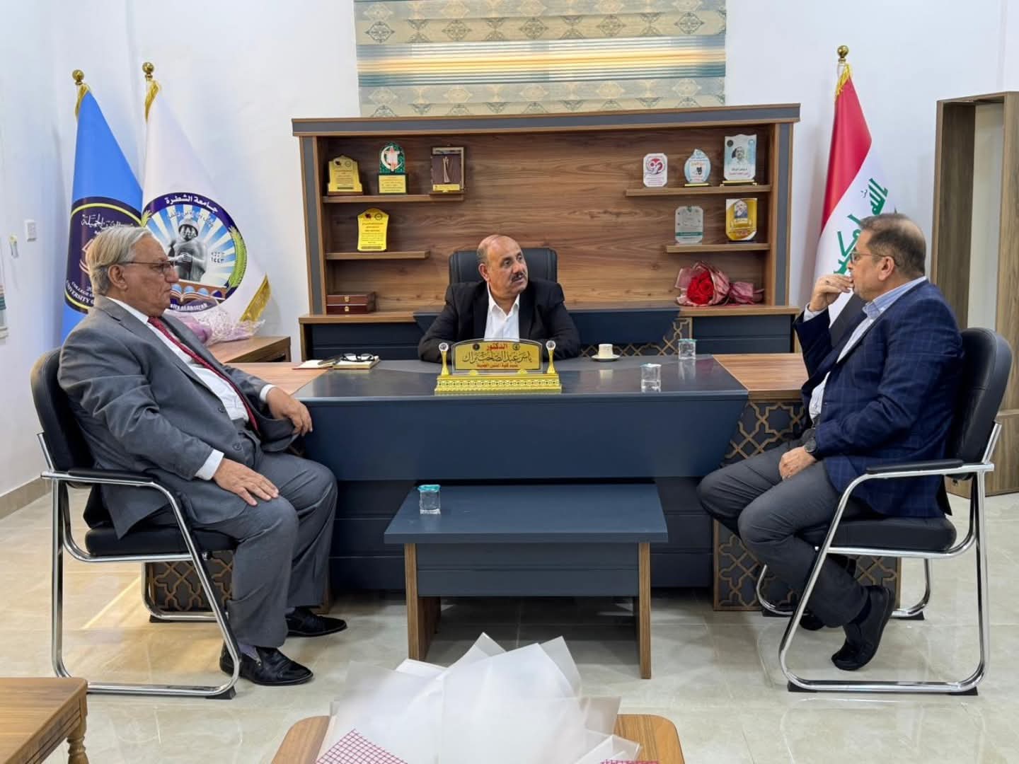 استقبل عميد كلية الفنون الجميلة الدكتور ياسر البراك، صباح اليوم الاثنين 29 أيلول 2025 في مكتبه الاستاذ المساعد الدكتور فيصل عبد عوده من قسم التربية الفنية بجامعة العين العراقية، والدكتور أحمد السعيدي التدريسي في كلية الإعلام بجامعة ذي قار.