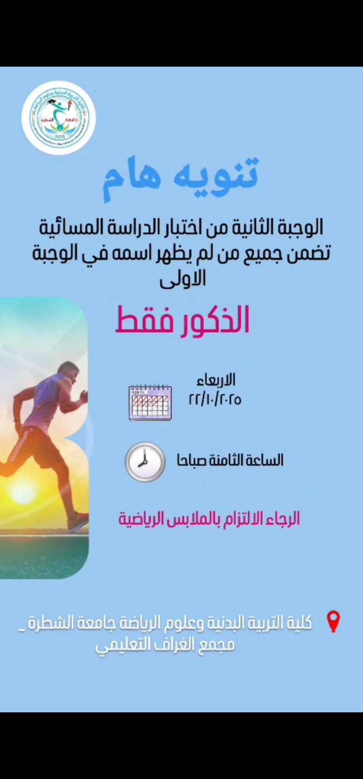 تعلن كلية التربية البدنية وعلوم الرياضة موعد اختبار للوجبة الثانية من الدراسة المسائية ( الاعدادي والمهني) للذكور فقط يشمل الاختبار ( جميع من لم يظهر اسمة في قائمة الوجبة الاولى)