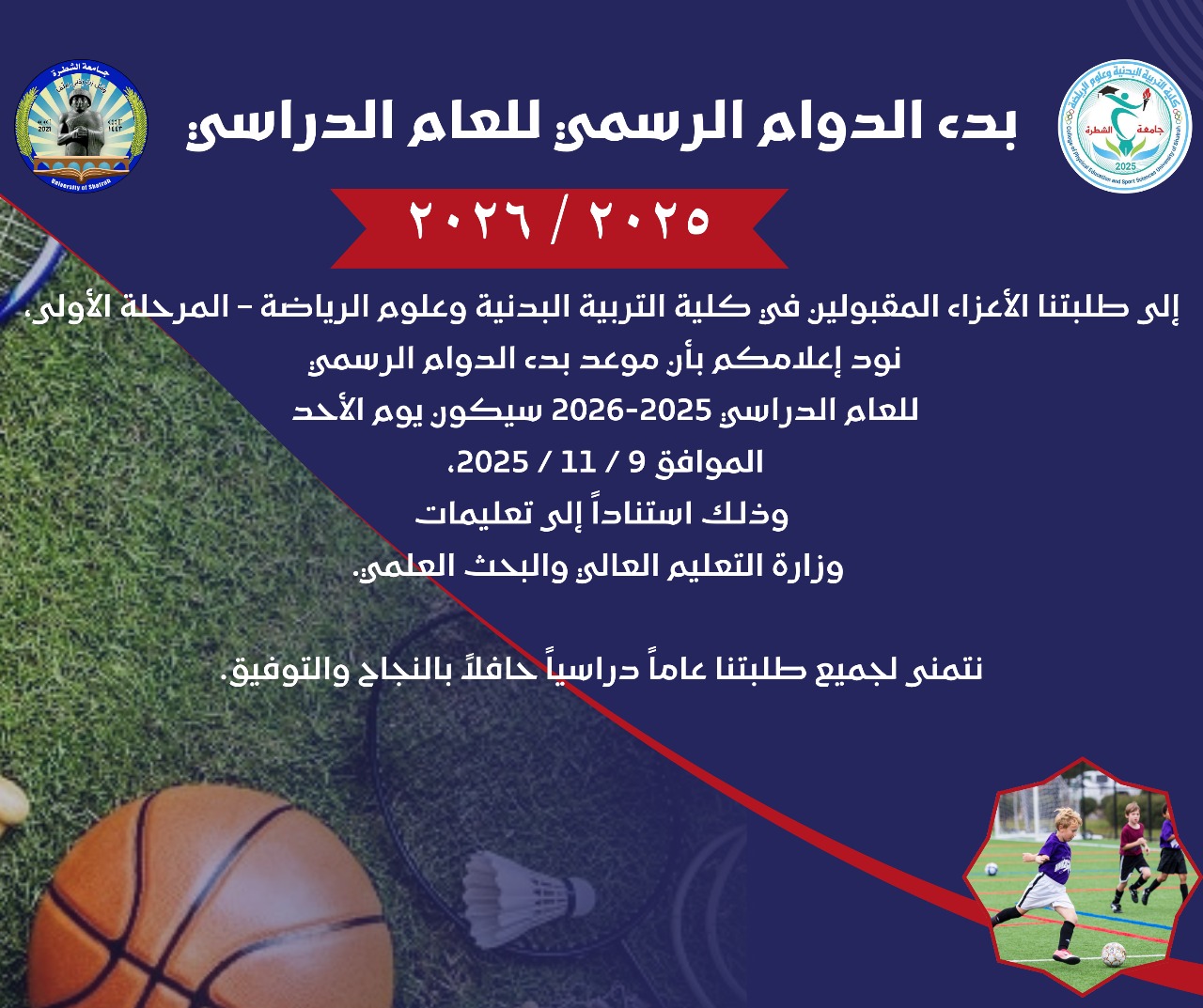 نود إعلامكم بأن موعد بدء الدوام الرسمي للعام الدراسي 2025-2026 سيكون يوم الأحد الموافق 9 / 11 / 2025، وذلك استناداً إلى تعليمات وزارة التعليم العالي والبحث العلمي.