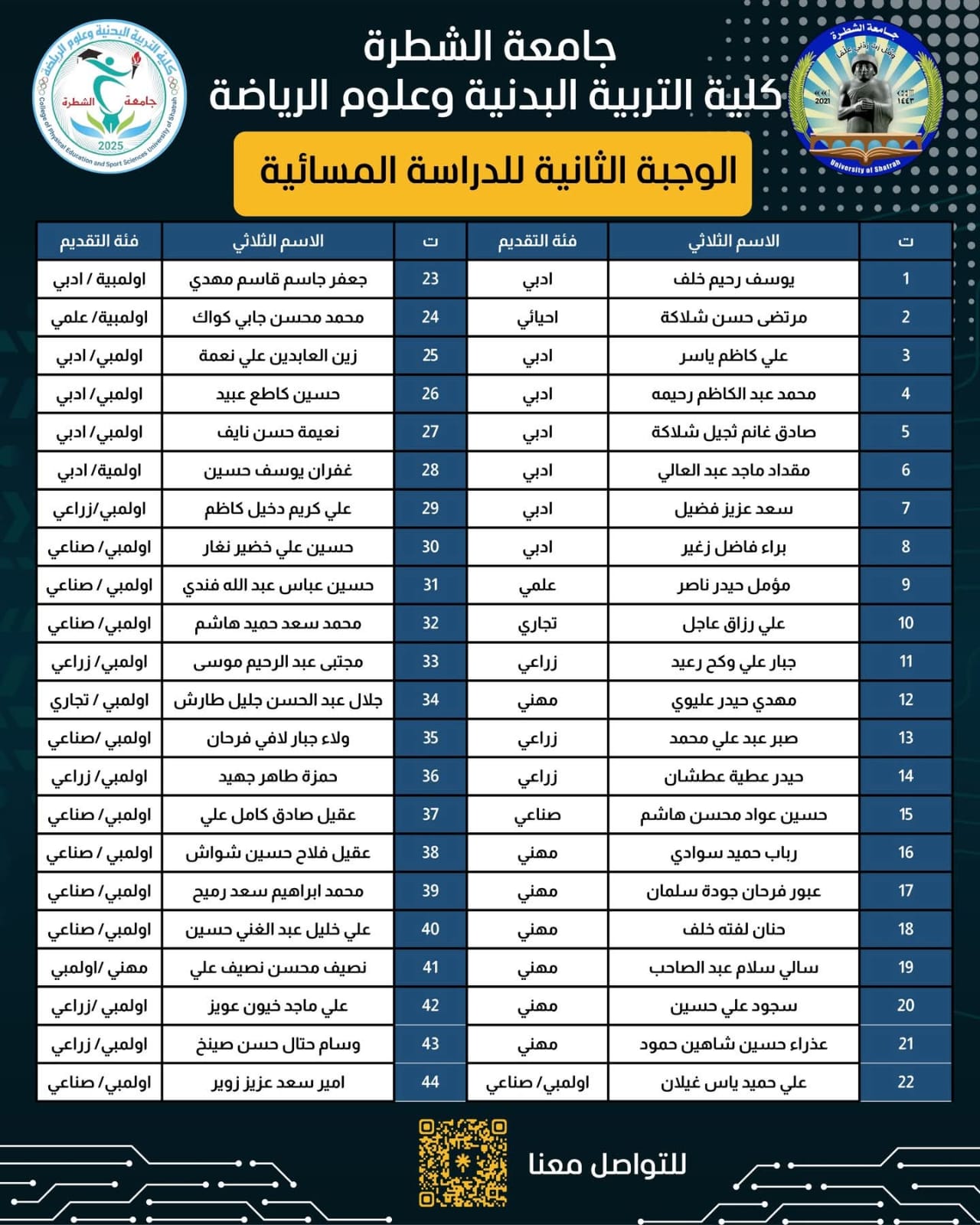 تُعلن كلية التربية البدنية وعلوم الرياضة عن أسماء الطلبة المقبولين في الدراسة المسائية للعام الدراسي (٢٠٢٥ – ٢٠٢٦).