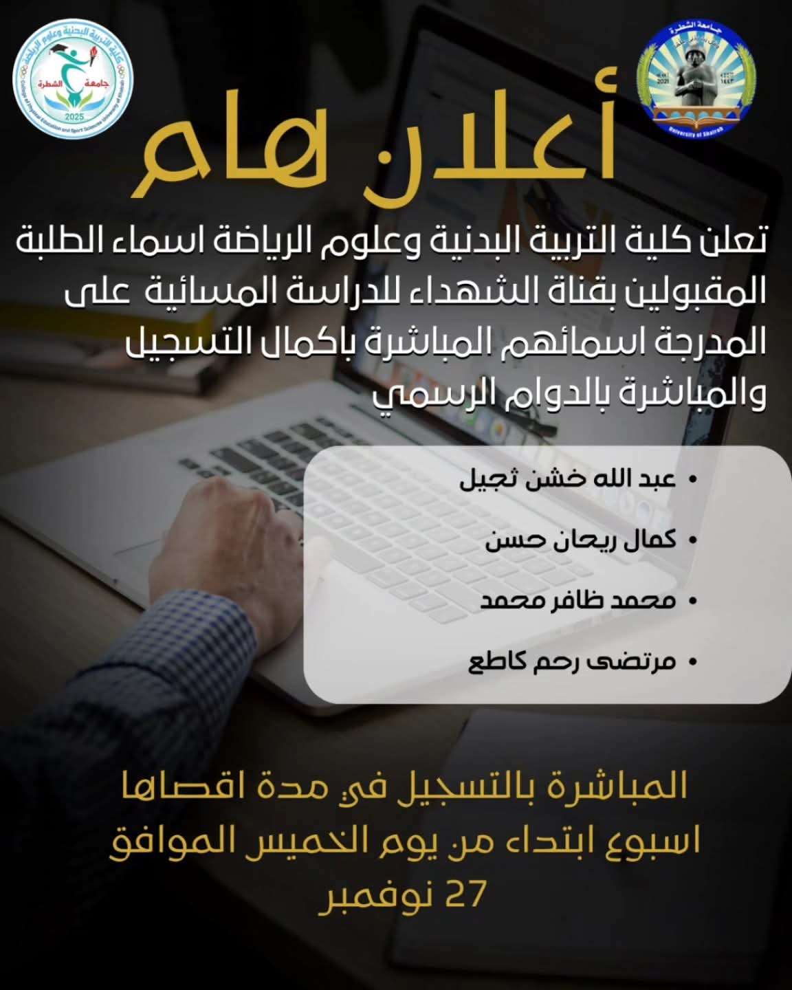 تعلن كلية التربية البدنية وعلوم الرياضة جامعة الشطرة