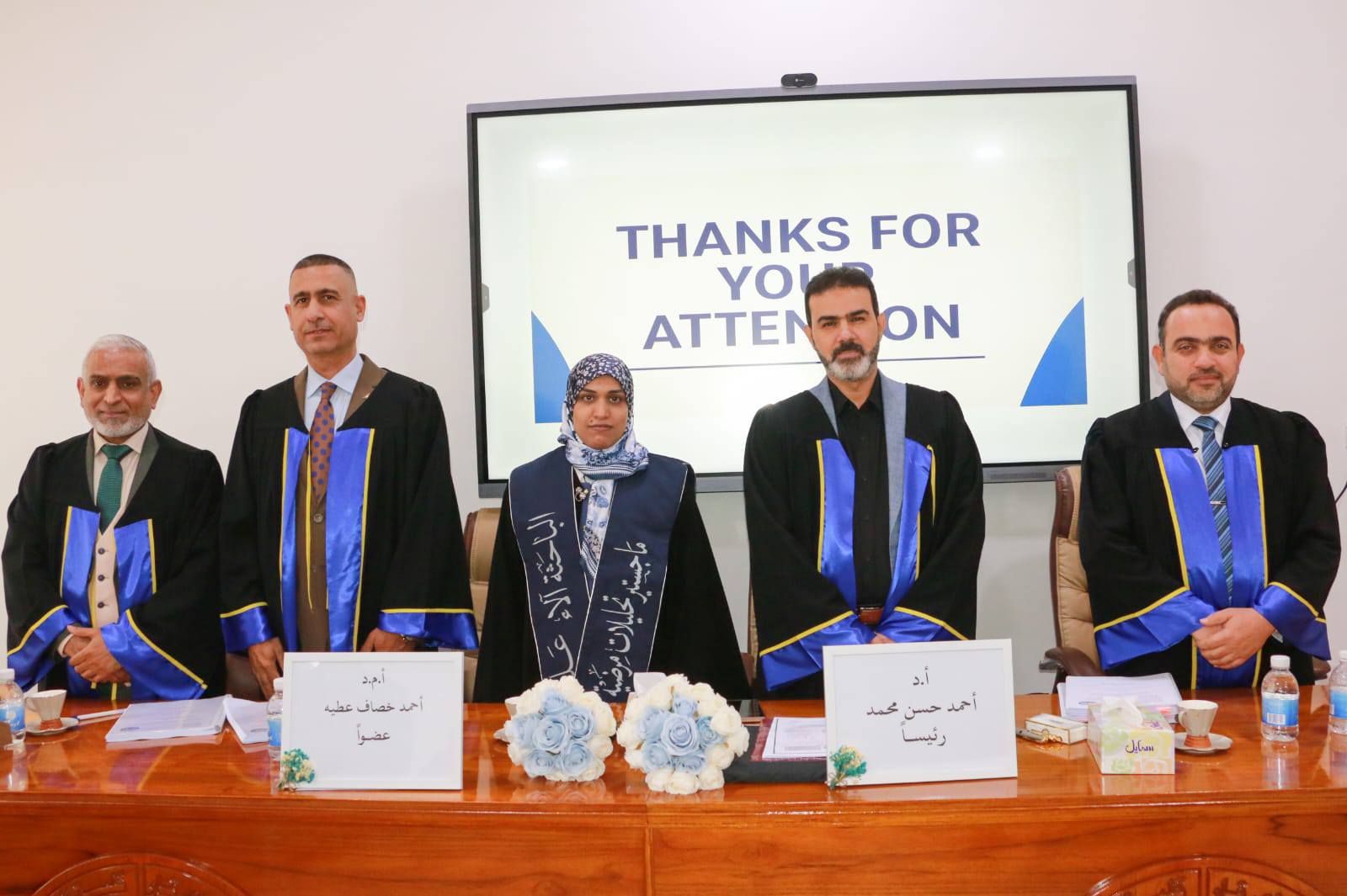 وفي ختام المناقشة، قررت اللجنة قبول الرسالة ومنح الطالبة شهادة الماجستير بتقدير (امتياز).
