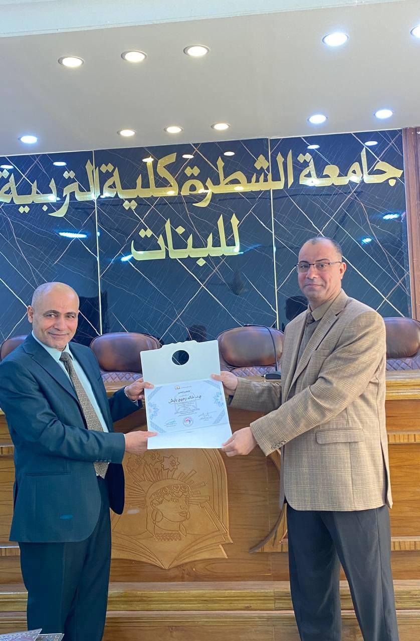 كما جرى تكريم الأستاذة الدكتورة أفراح عبد مكطوف عميد كلية التربية للبنات بدرع وشهادة تقديرية، تقديرًا لدورها في دعم الأنشطة الثقافية والأدبية.