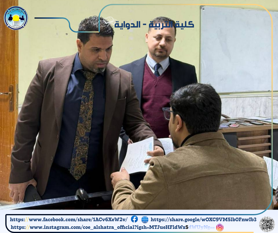 تتواصل في كلية التربية _جامعة الشطرة سير الامتحانات الفصلية لقسمي اللغة الإنكليزية والفيزياء، في أجواء يسودها التنظيم والانضباط العالي، وذلك بإشراف وتوجيه السيد عميد الكلية أ.م.د صفاء حسين علي ومتابعة ميدانية مباشرة من قبل السيد معاون العميد للشؤون الادارية والعلمية م.رحمن عيسى صافي، للاطلاع على مجريات الامتحانات وضمان توفير البيئة المناسبة التي تسهم في إنجاح العملية الامتحانية.
