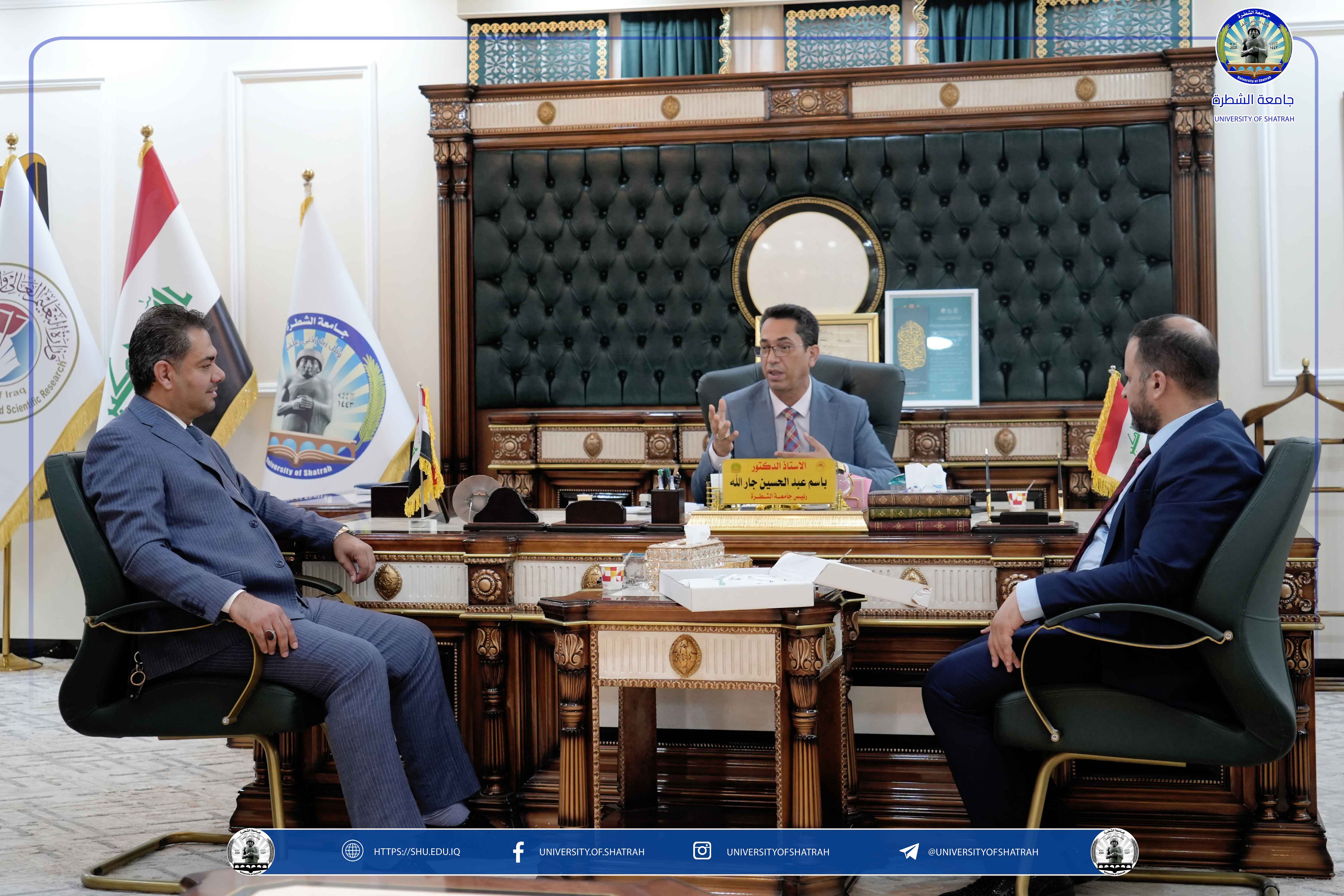 استقبل رئيس جامعة الشطرة الأستاذ الدكتور باسم عبد الحسين جار الله وفداً من جهاز الأمن الوطني ومفوضية حقوق الإنسان، وذلك على هامش الاحتفال المركزي الذي أقامته الجامعة بمناسبة اليوم الوطني العراقي يوم الخميس الخميس 2 تشرين الأول 2025 في مكتبه