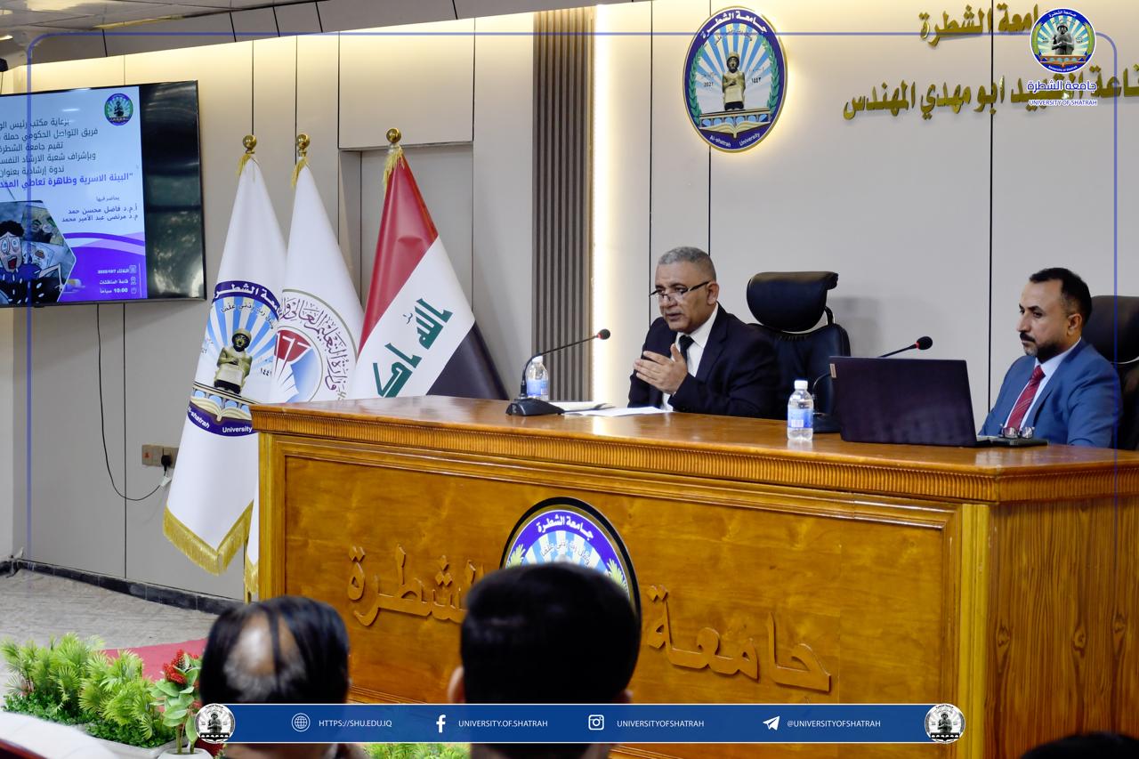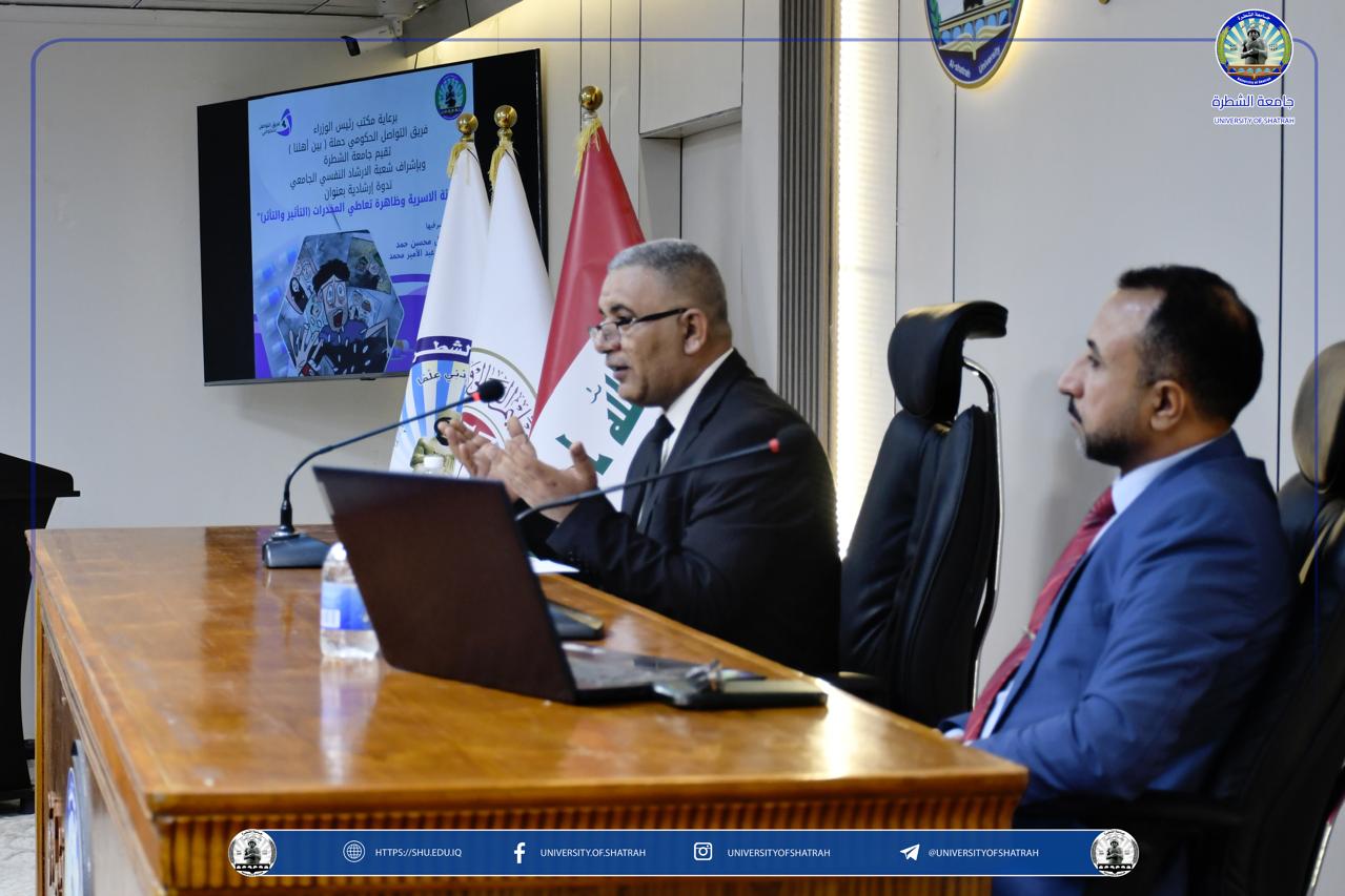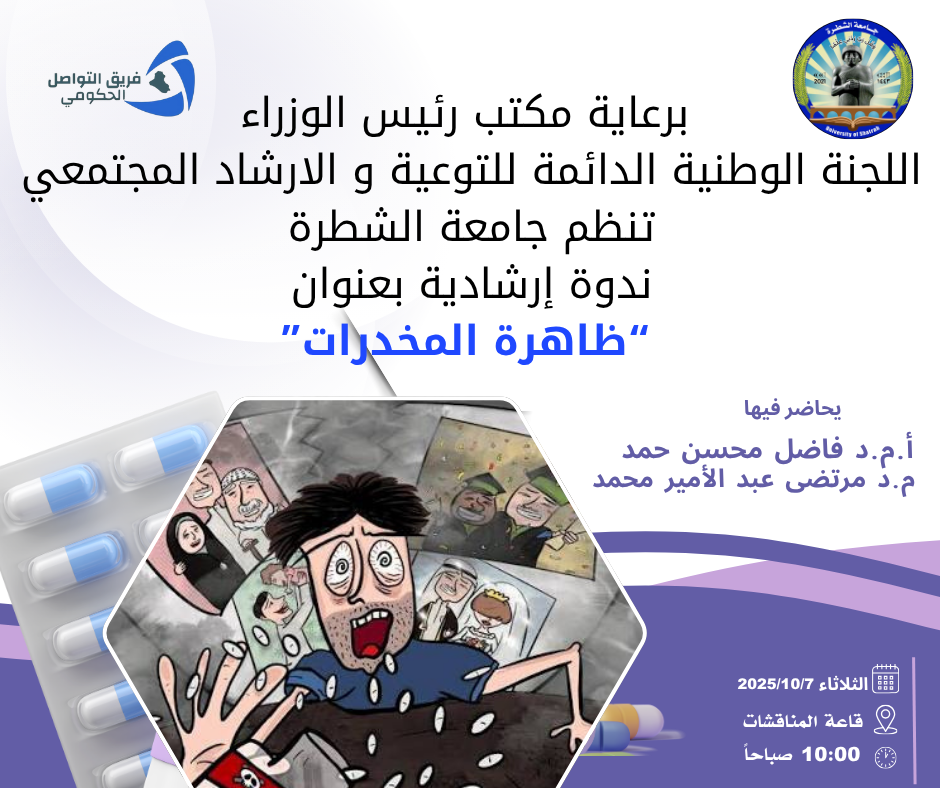 برعاية مكتب رئيس الوزراء / اللجنة الوطنية الدائمة للتوعية و الارشاد المجتمعي جامعة الشطرة تنظّم ندوة إرشادية بعنوان “ظاهرة المخدرات”